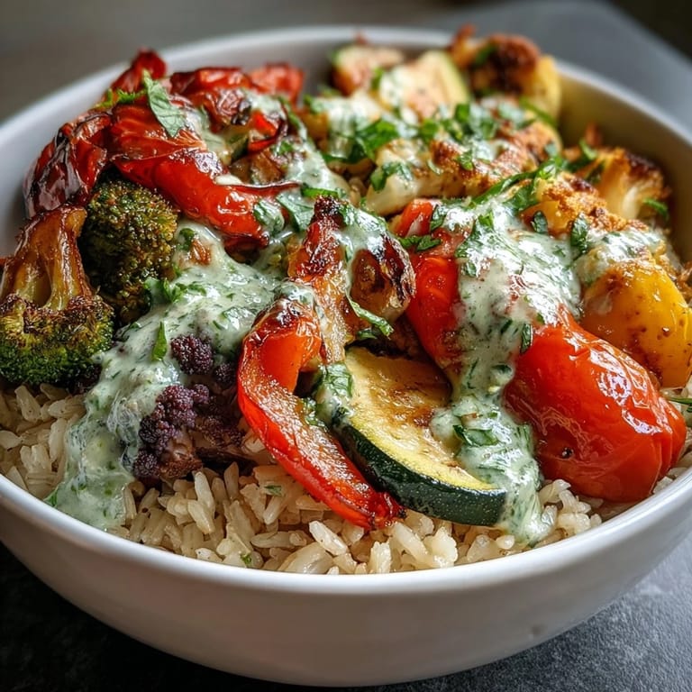 - Divide fluffy brown rice among bowls, scatter the warm roasted vegetables over top, and drizzle everything generously with that bright green herb sauce. The warm vegetables and cool sauce create this temperature contrast that feels luxurious somehow.